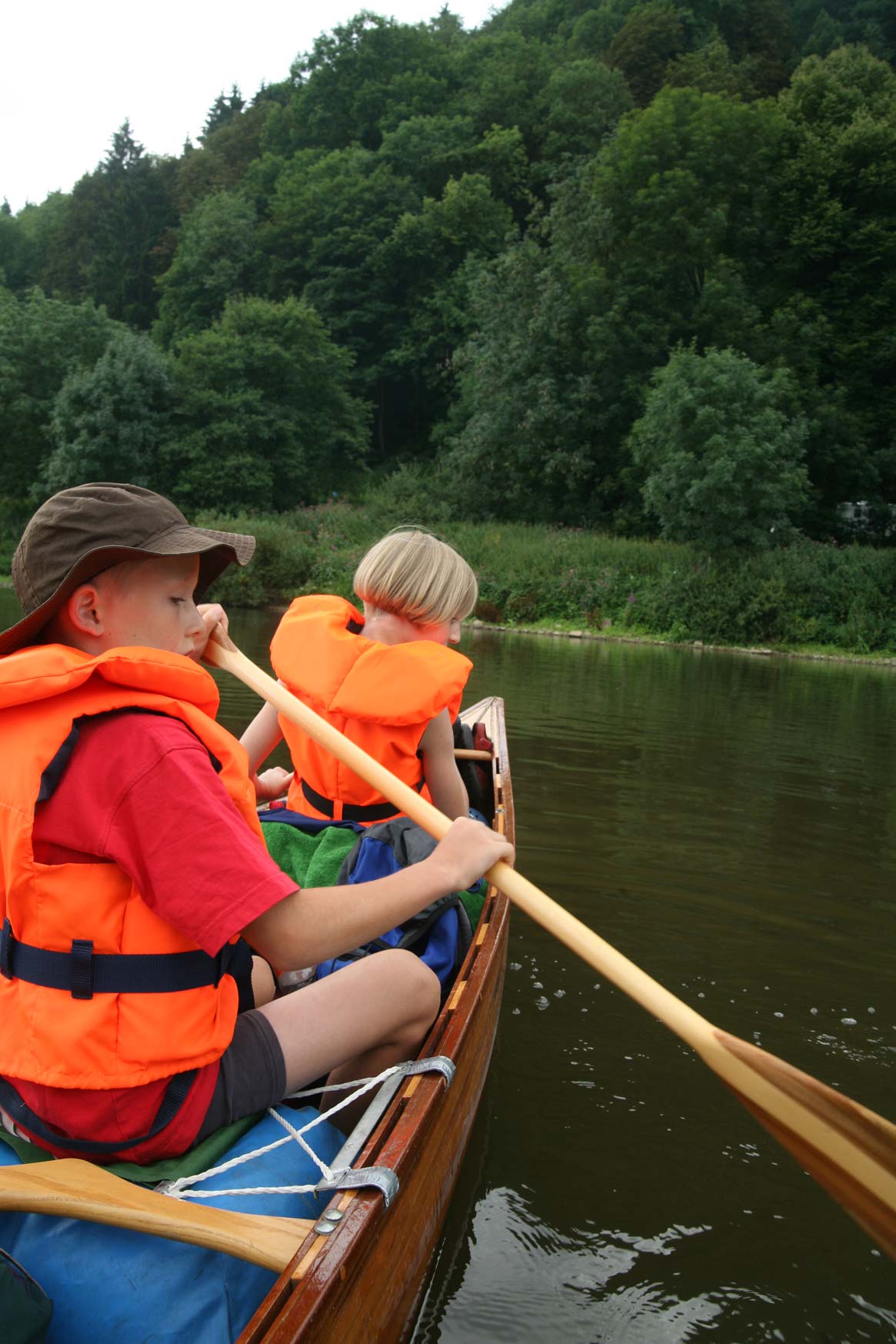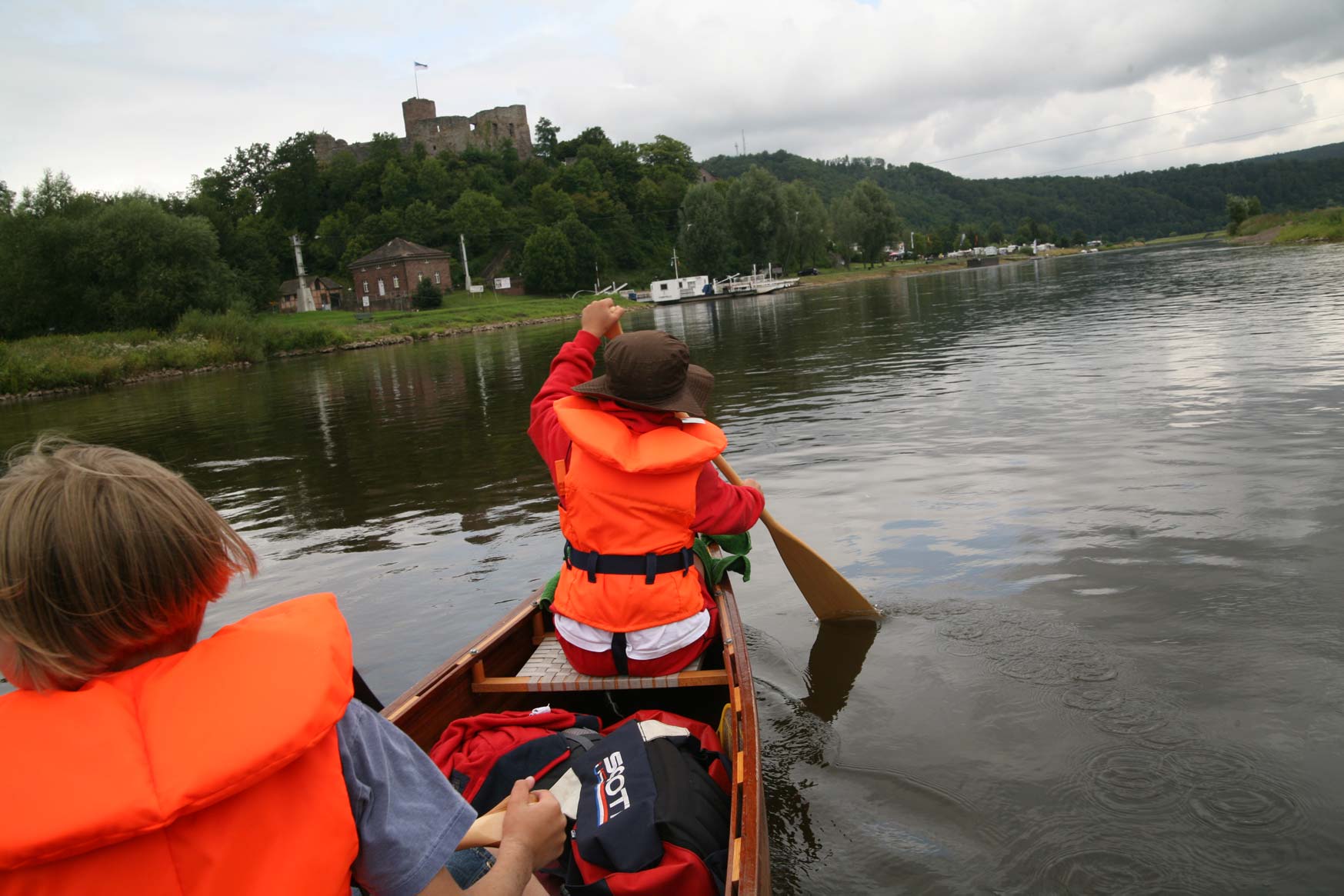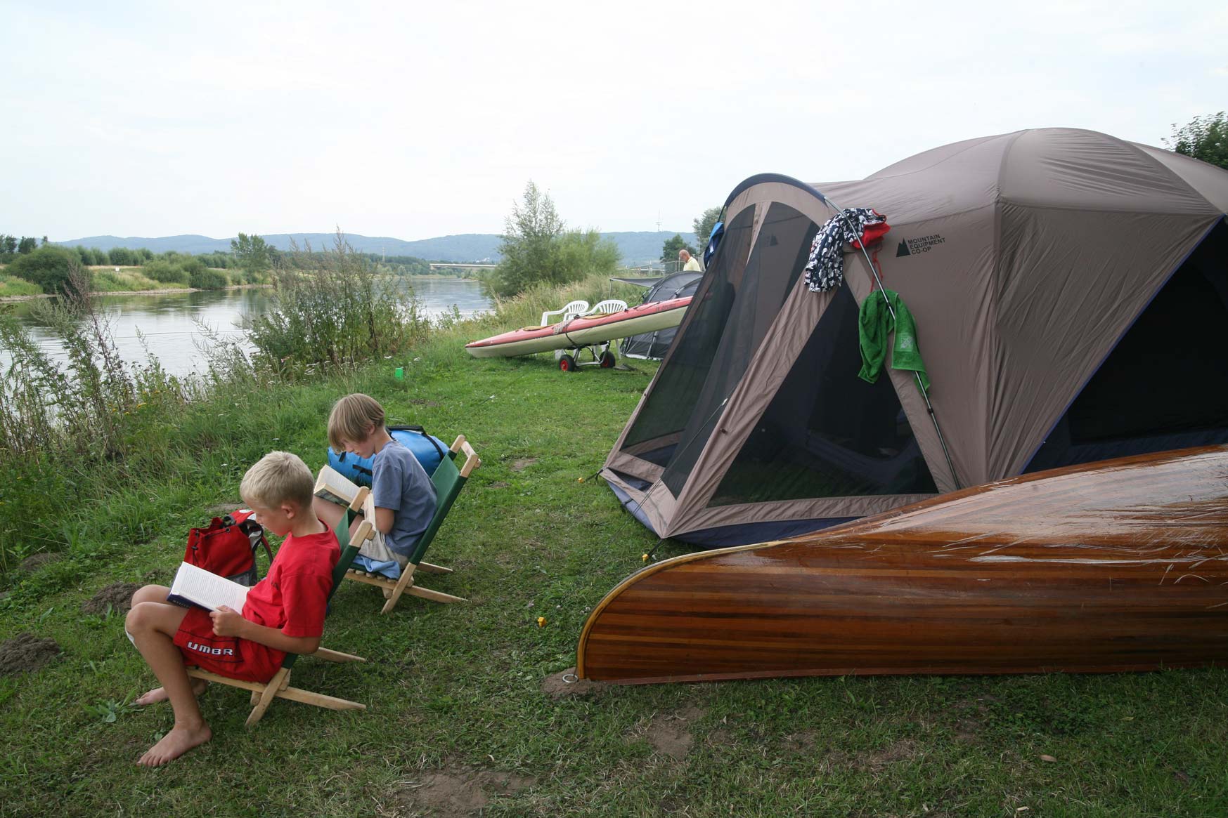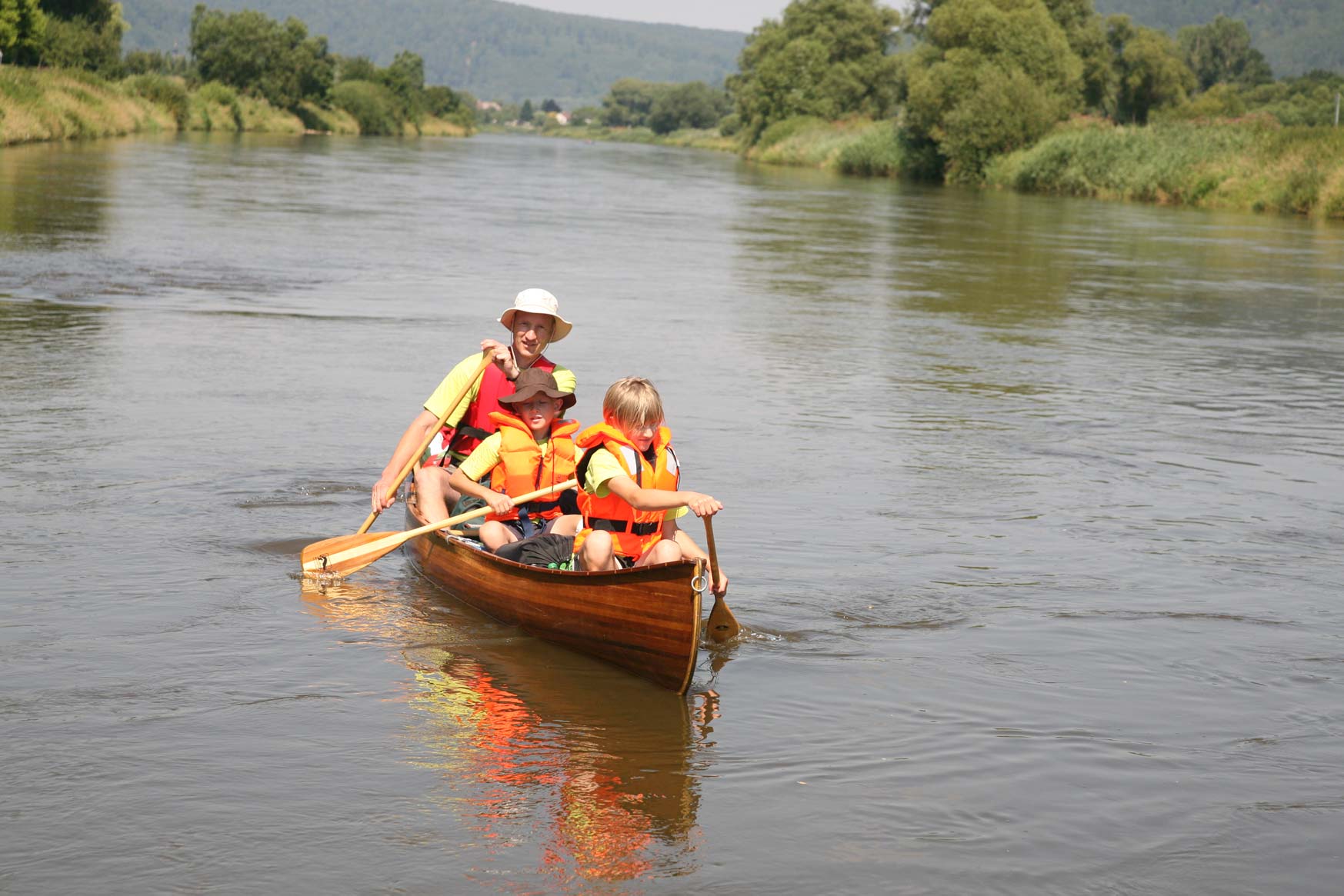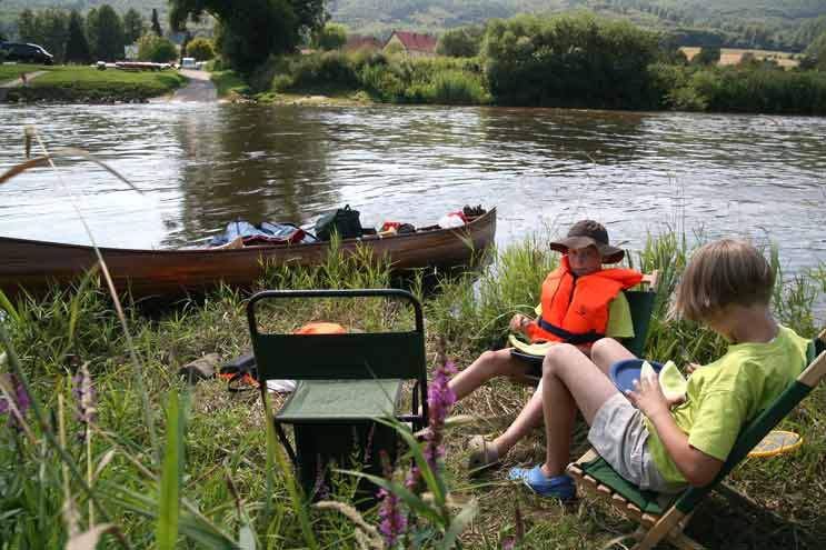 Und so grübelt Michael und wälzt Kanuführer und Karten, bis er schließlich einen Vorschlag hat: die Weser. Von Hannoversch Münden bis Minden fließt diese durchs schöne Weserbergland, immer munter strömend – da braucht man nicht so dolle zu paddeln – und ganz ohne Umtragestellen, 200 Kilometer weit. Die Kinder hören sich alles gut an, nur Felix hakt einmal nach: „Und wirklich jeden Tag zelten, keine Tricks.“ Dann willigen sie ein.