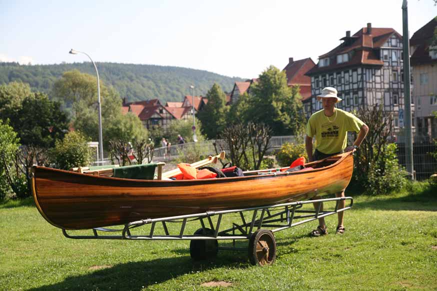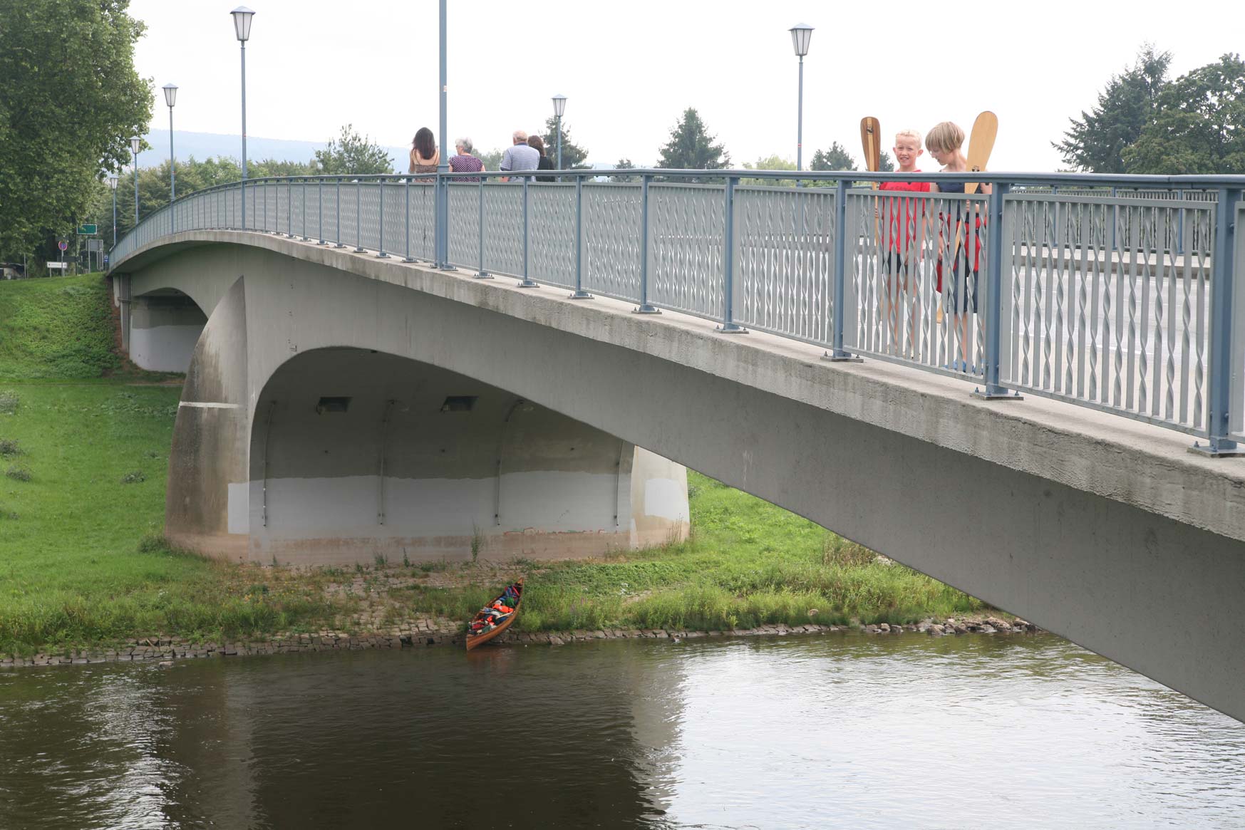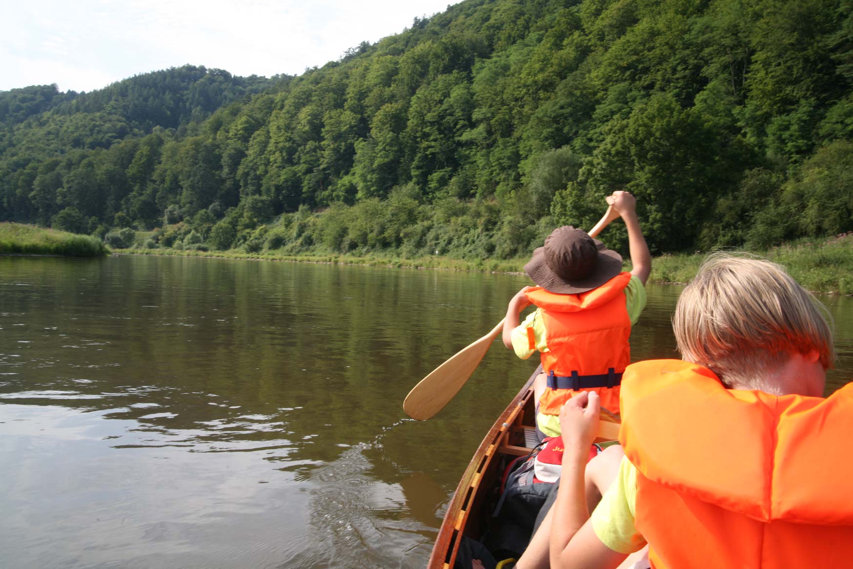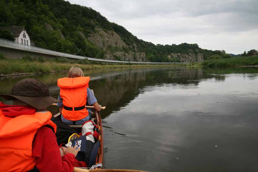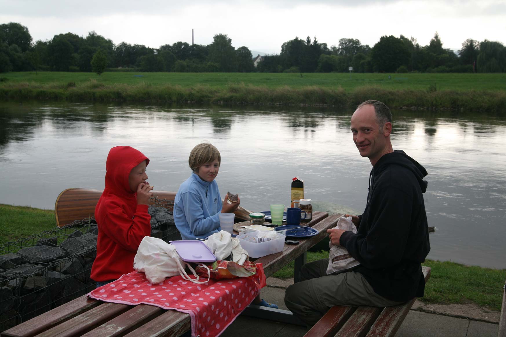 Und so grübelt Michael und wälzt Kanuführer und Karten, bis er schließlich einen Vorschlag hat: die Weser. Von Hannoversch Münden bis Minden fließt diese durchs schöne Weserbergland, immer munter strömend – da braucht man nicht so dolle zu paddeln – und ganz ohne Umtragestellen, 200 Kilometer weit. Die Kinder hören sich alles gut an, nur Felix hakt einmal nach: „Und wirklich jeden Tag zelten, keine Tricks.“ Dann willigen sie ein.
