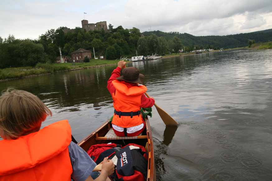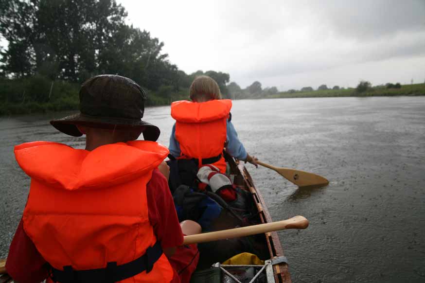 Kurz nach Hameln beginnt es zu regnen. Michael kommt das ungelegen, denn bei Regen wird’s im Kanu nass, und erkälten kann man sich obendrein. Vor allem möchte sich Michael nicht vorwerfen, er hätte seine Kinder ungenügend vor Wind und Wetter geschützt.