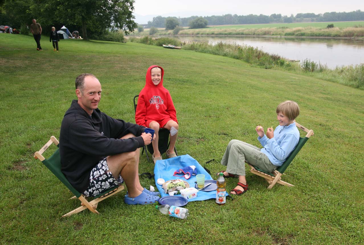 Und so chauffieren Felix und Franziska ihren Vater, der nun seinerseits alle Zeit und Muße hat, entspannt Landschaft, Tierwelt und seinen vor ihm sitzenden hart paddelnden Kindern zuzugucken, nach Bad Karlshafen. Dort halten die drei auf dem Zeltplatt bei Limo und Bier vorerst noch mit offenen Karten doch noch die wohlverdiente Skatrunde. Am ersten Paddeltag kommt jeder auf seine Kosten.