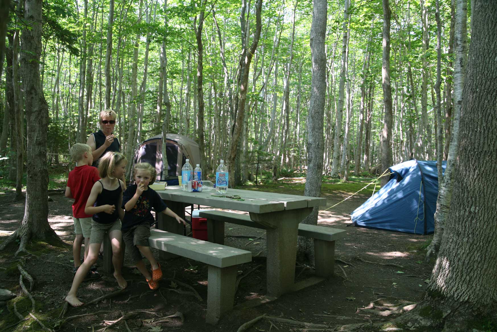 Im Cape Breton Highlands National Park zelten wir auf unserem bisher schönsten Zeltplatz. Mitten im Wald, mit Picknickbank und Feuerstelle,