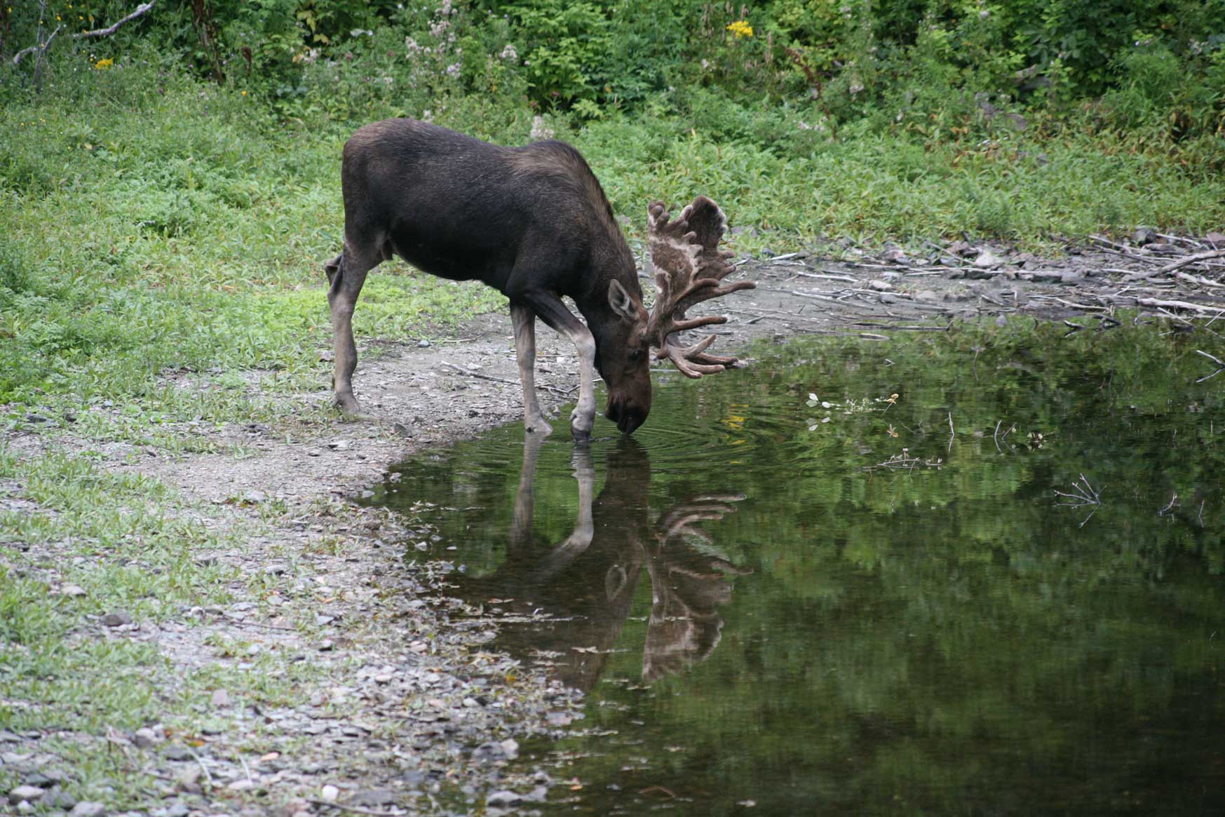 energisch in Schutz. Elchbullen sind nicht so neugierig. Unser Ranger meint, außer Elchkühen und Nebenbuhlern bringt sie so schnell nichts aus der Ruhe. Da kann der abendliche Schluck aus dem See schnell ein