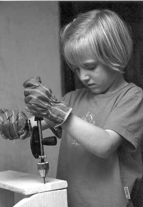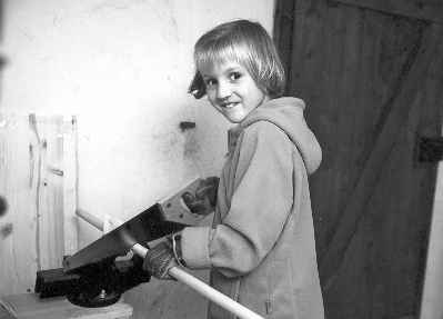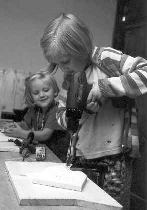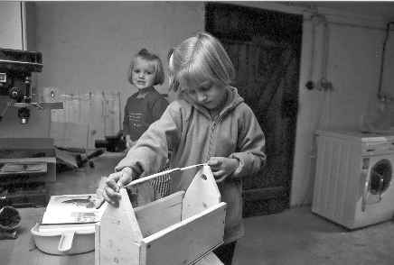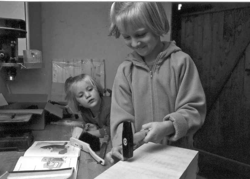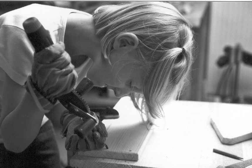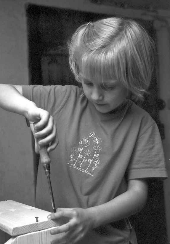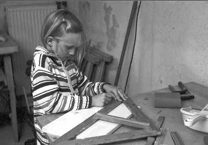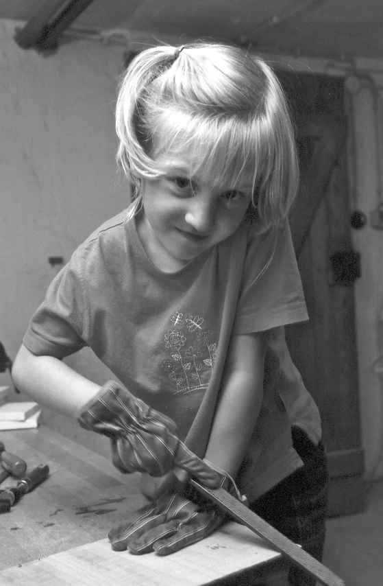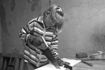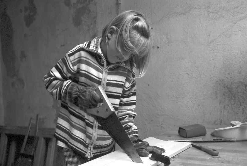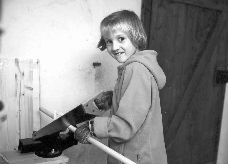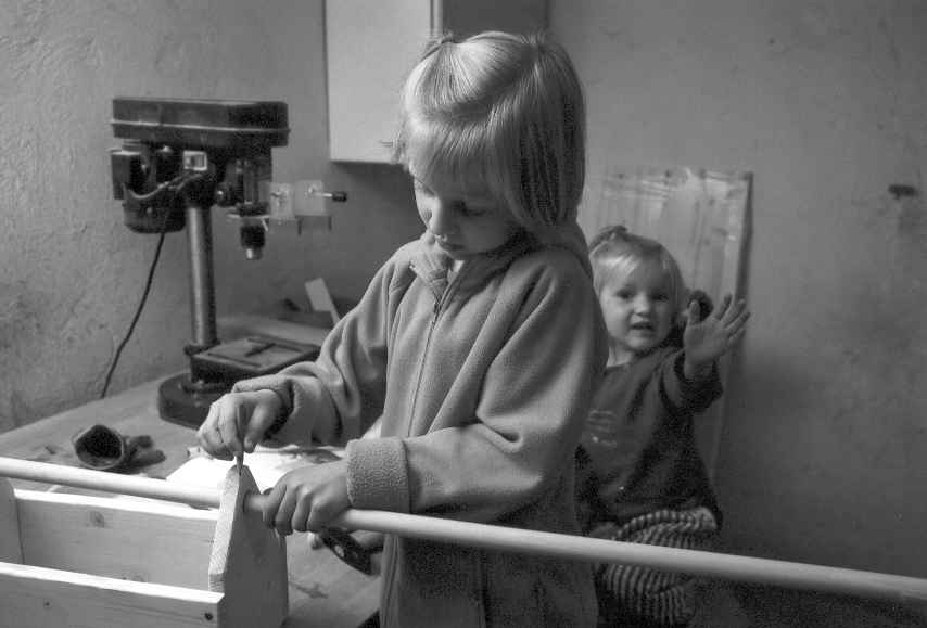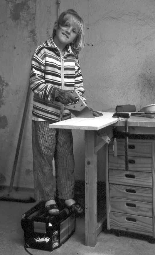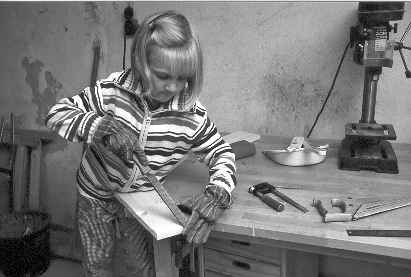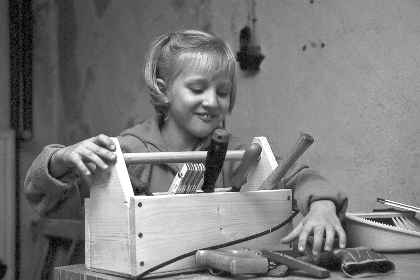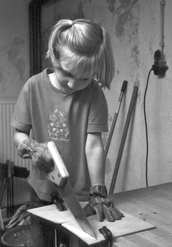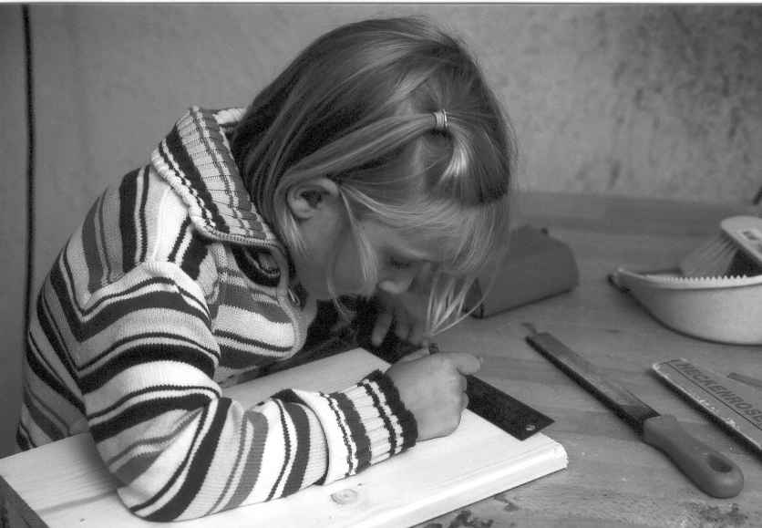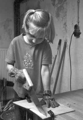 Der Kistenboden ist aus Sperrholz. Da heißt es sägen, feilen und festnageln. Katharina guckt aufmerksam zu. Will sie auch mal alles können.
